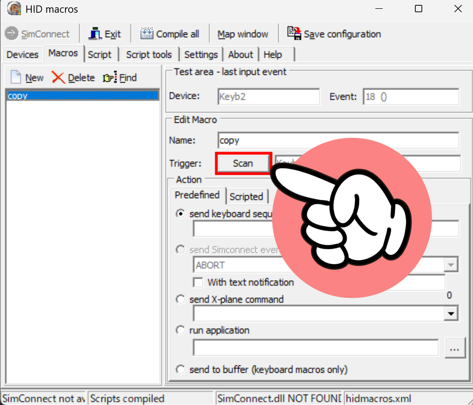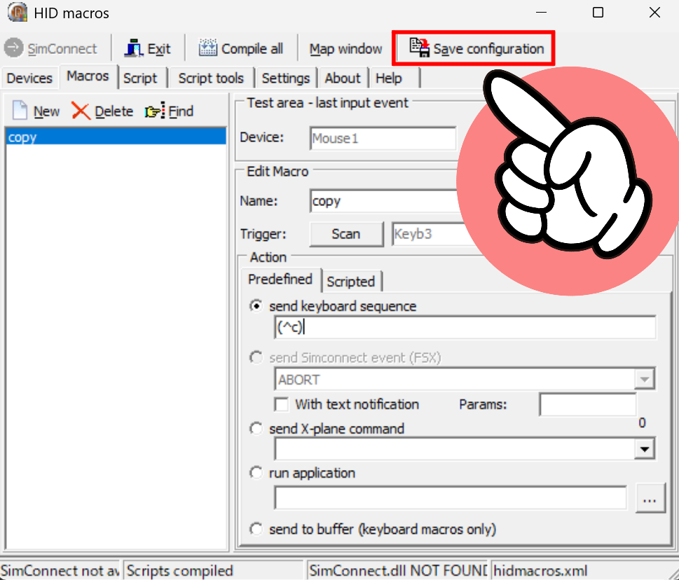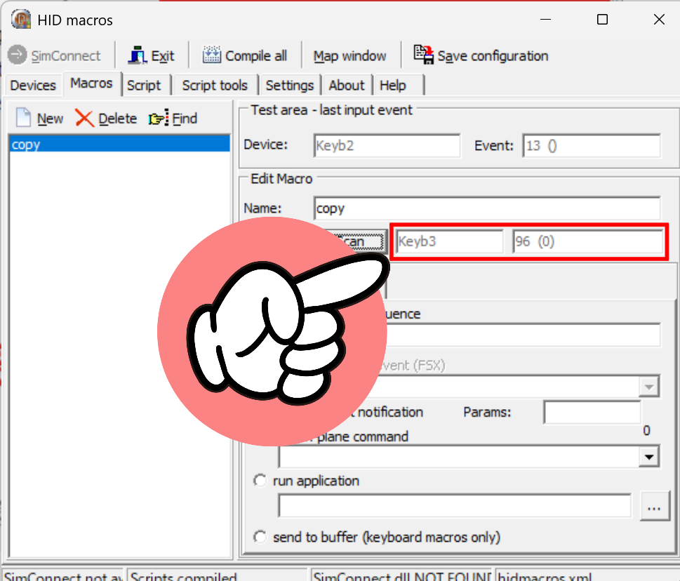 私の場合はコピー機能を付けたいので、『Ctrl + C』のショートカットキーを入れていく事になるんですが、HIDMacrosにそのまま入力しても反映されませんので、SendKey方式で入力しないといけないようです。